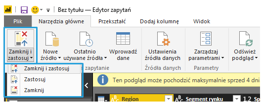 Jeżeli w załadowanych danych wprowadzam modyfikacje to wówczas wybieram opcję Narzędzia główne > Zamknij > Zamknij i zastosuj lub Zastosuj (w zależności od tego czy wychodzę z Edytora zapytań czy w nim pozostaję).