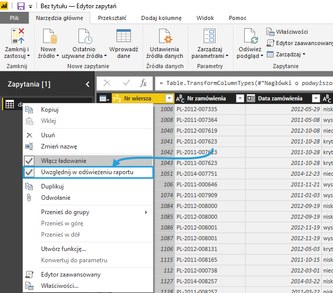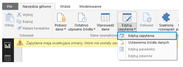 W wyniku odznaczenia opcji Włącz ładowanie do raportu załadowane dane nie będą widoczne w modelu/raporcie, ale wciąż będą dostępne do edycji poprzez Narzędzia główne > Dane zewnętrzne > Edytuj zapytania > Edytuj zapytania. Tu można je nadal przekształcać a w dowolnym momencie dołączyć do modelu.