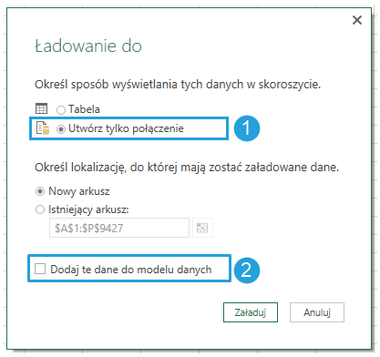 Gdy ładuję dane do Excela z Power Query, sterowanie znajduje się w oknie Ładowanie do, gdzie aby nie ładować danych do Excela (i ewentualnie modelu danych), wybieram Utwórz tylko połączenie i odznaczam opcję Dodaj te dane do modelu danych.