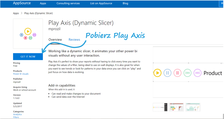 Na pewno nie raz odtwarzałeś muzykę – kojarzysz panel do przewijania utworów, pauzowania, włączania ich znowu? To właśnie Play Axis, ale w przeciwieństwie do odtwarzacza muzyki, on odtwarza Twoje dane. Play Axis działa jak filtr – automatycznie zmienia wartość zmiennej filtrującej i pokazuje odpowiadającą jej wizualizację z Twoich danych. Jest to niestandardowa wizualizacja Power BI do pobrania za darmo ze sklepu Microsoft.
