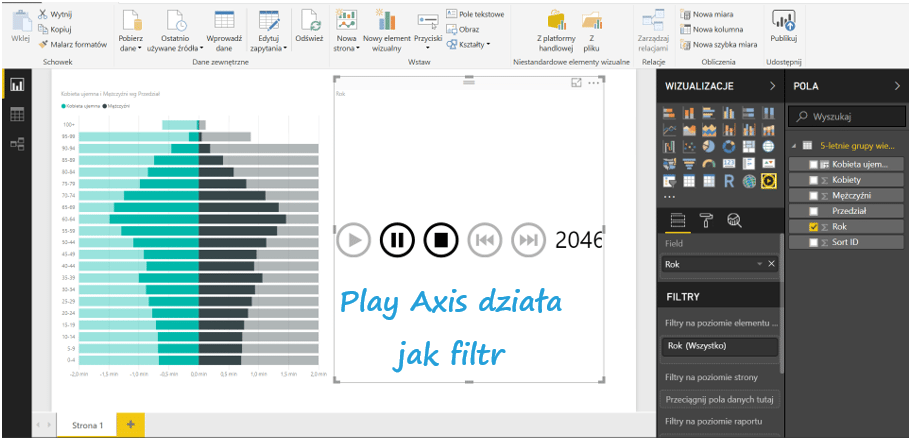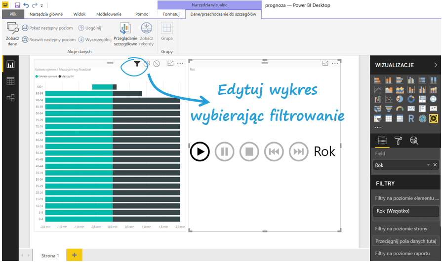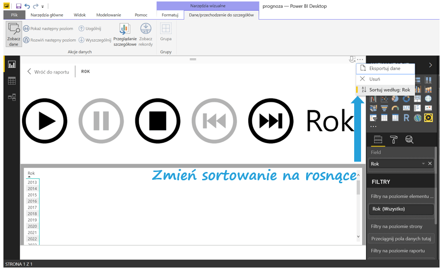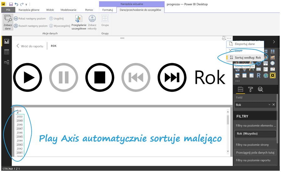 Play Axis od razu sortuje dane, które wykorzystuje do filtrowania, dzięki czemu dane w tym wypadku pokazywane są chronologicznie… ale malejąco. Oznacza to, że lata biegną od 2050 do 2013. Kliknij na górze w zakładce Narzędzia wizualne > Dane/przechodzenie do szczegółów. Następnie, w prawym górnym rogu kliknij w trzy kropki oraz Sortuj według: Rok. Zobacz, że do tej pory sortowanie jest od Z do A.