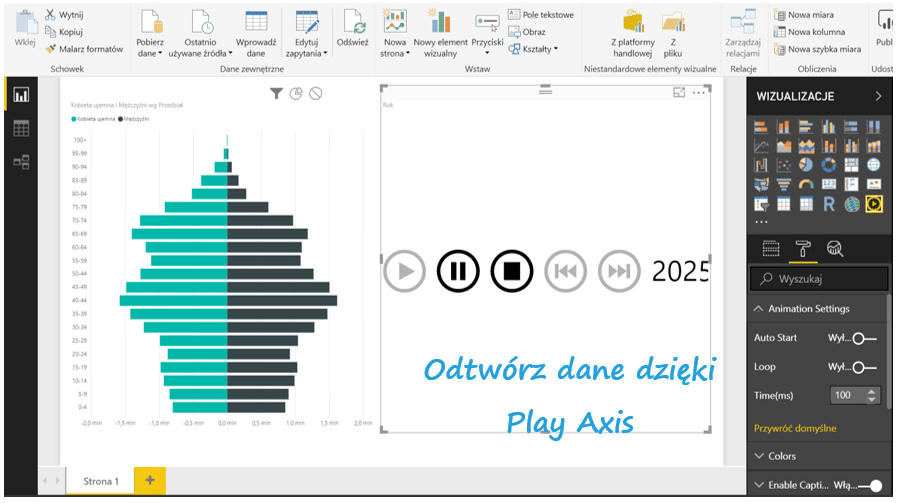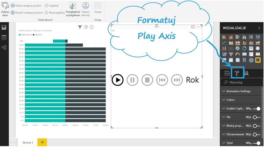 Ostatnim elementem, który zmienimy jest tempo zmian. Nie ukrywajmy – teraz jest bardzo wolne. W panelu Wizualizacje po zaznaczeniu grafiki Play Axis pojawia się możliwość formatowania po kliknięciu na pędzel Format.