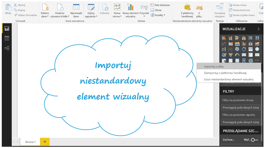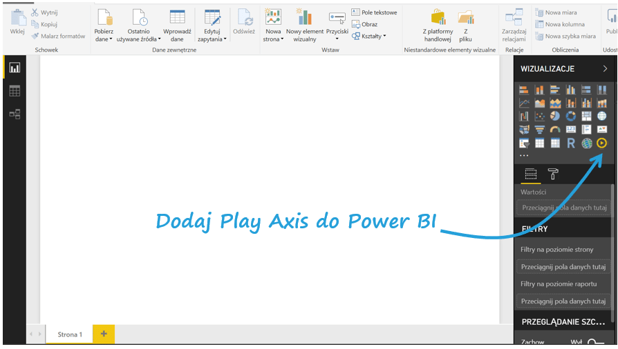 Wgranie niestandardowej wizualizacji Play Axis to nic trudnego. Otwórz Power BI i w panelu Wizualizacje kliknij na trzy kropki Importuj niestandardowy element wizualny > Importuj z Pliku, a następnie w pobranych plikach znajdź Play Axis.