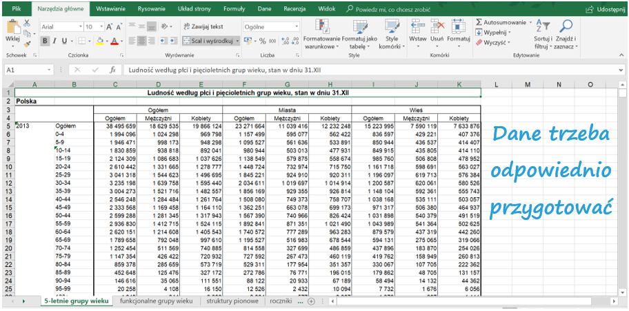 Co sprawia, że piramida demograficzna na stronie internetowej GUS-u jest taka atrakcyjna? Nie ukrywajmy – możliwość wciśnięcia „Start” i obserwowania, jak zmienia się struktura wieku w czasie. My uzyskamy ten sam efekt stosując wizualizację Play Axis. Pobrałem dane w Excelu Prognoza ludzkości na lata 2014–2050 – Polska ze strony GUS-u. W arkuszu 5-letnie grupy wieku znajdziemy wszystko, co nas interesuje.
