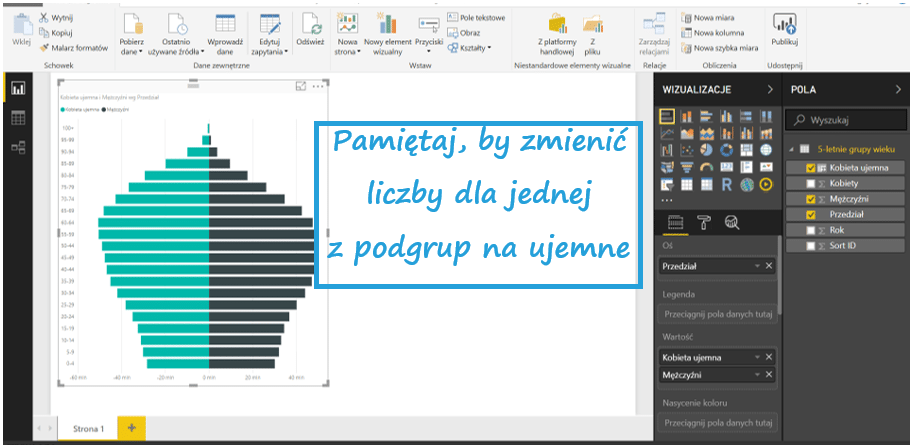 Gotowe dane wgrywam do Power BI i wstawiam Skumulowany wykres słupkowy, czyli pierwszy kwadrat w panelu Wizualizacje. W pole Oś przesuwam Przedział, czyli przedziały wiekowe ludności, natomiast w wartościach znajdują się liczebności kobiet (ujemne) i mężczyzn.