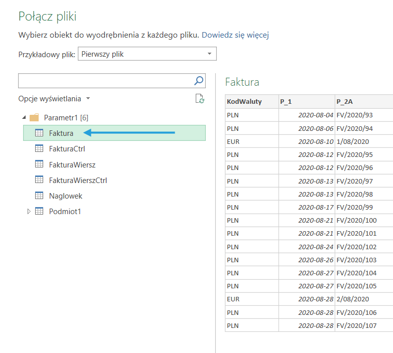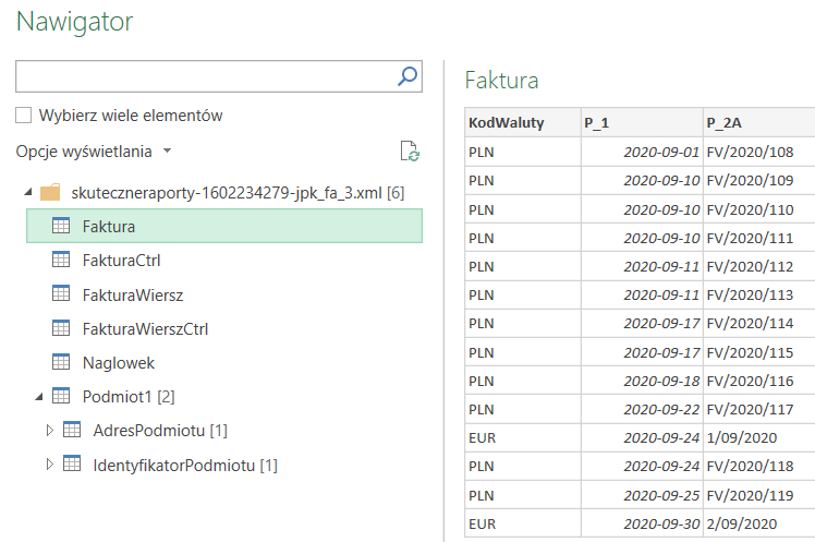 Plik może składać się z 1 tabeli, ale może mieć w sobie kilka struktur. W oknie nawigatora Power Query wybieramy interesujący nas element (albo wszystkie, wybierając checkbox Wybierz wiele elementów) i klikamy Przekształć dane.