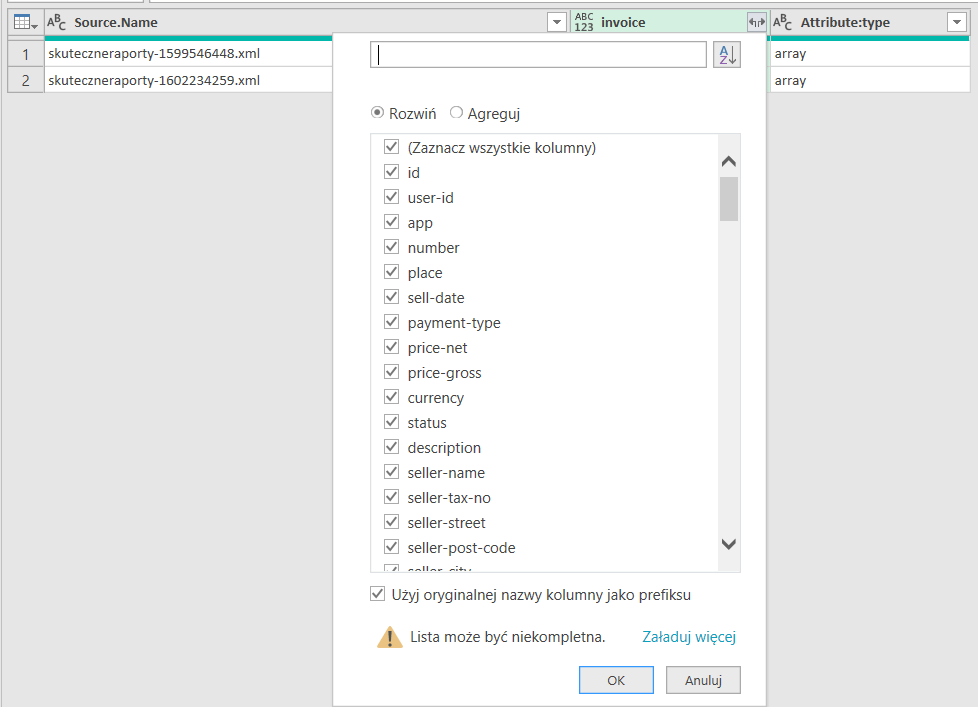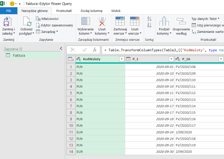 Na koniec stosując standardowe sposoby pracy z danymi w Power Query przygotowujemy tabelę z danymi, którą ładujemy do Excela lub Power BI.