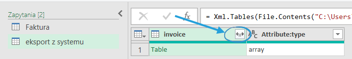 Klikamy wówczas ikoną Rozwiń w lewym górnym rogu kolumny i schodzimy na kolejne poziomy struktury XML-a. Tam mogą czekać na nas kolejne obiekty typu Table, które rozpakowujemy, szukając interesujących nas danych.