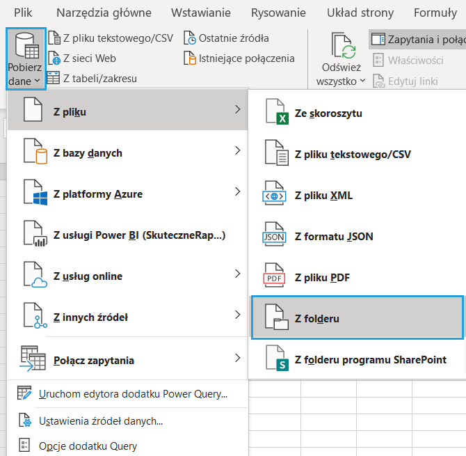 Proces pobierania danych rozpoczynamy od przycisku Pobierz dane na karcie Dane > Z pliku > Z pliku XML.