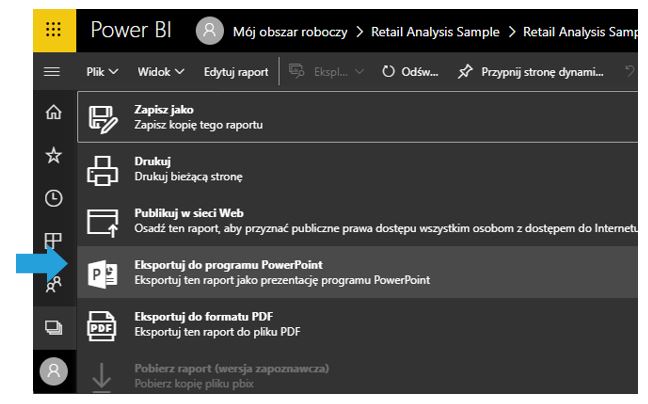 Jeżeli raport jest opublikowany na witrynie Power BI, wówczas logując się na swoje konto w usłudze, możesz go łatwo wyeksportować do programu PowerPoint. Gdy zostanie wyświetlony w Power BI Online, wybieramy na pasku menu: Plik > Eksportuj do programu PowerPoint.