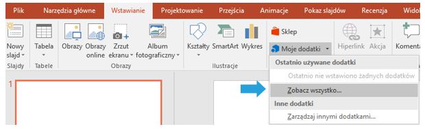 Aby zainstalować dodatek, uruchamiamy PowerPointa, w menu Wstawianie wybieramy > Dodatki > Mój dodatki > Zobacz wszystko.