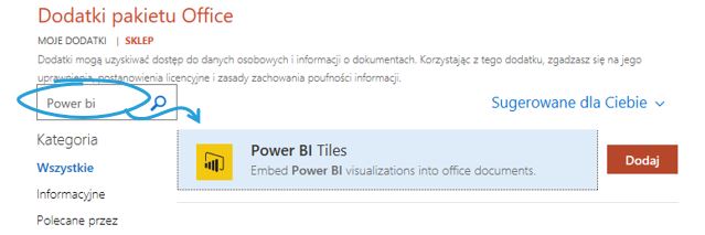 W polu wyszukiwania wpisuję: Power BI. Wynikiem wyszukiwania jest dodatek Power BI Tiles. Wybieram przycisk Dodaj by załadować dodatek.