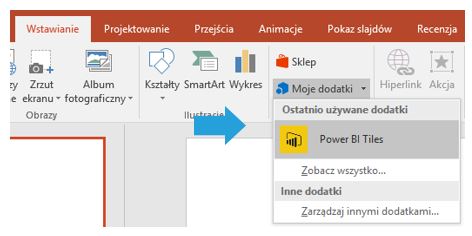 Po tej operacji w sekcji Wstawianie powinna by widoczna zakładka z dodatkiem Power BI Tiles.
