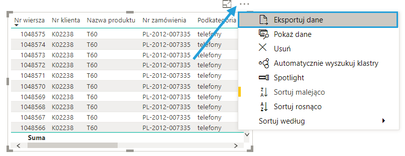 Dane widoczne w wizualizacji Power BI można wyeksportować do pliku CSV, który z kolei można wczytać przez Power Query do programu Excel. W testach udało mi się uzyskać plik CSV o maksymalnie 30 000 wierszy.