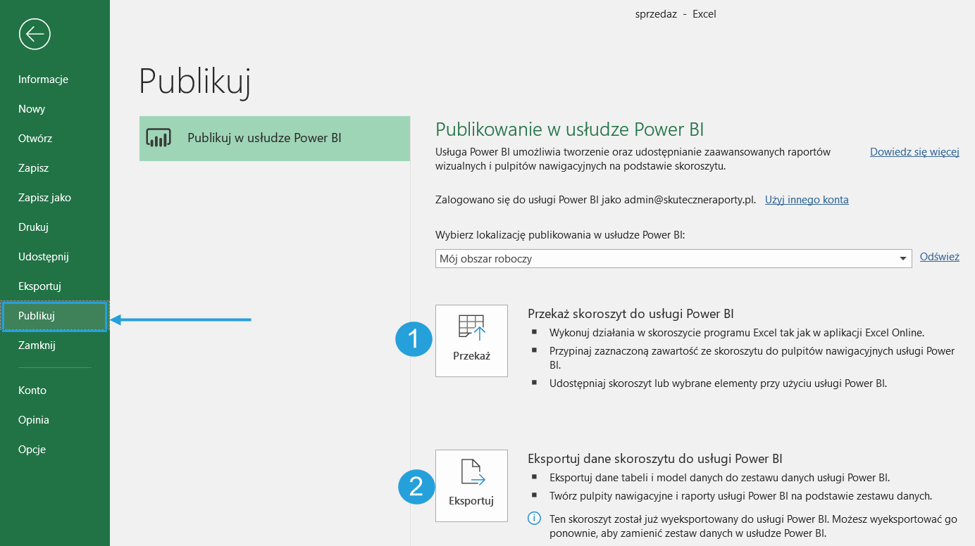 Nowość w Office 365, która pozwala opublikować plik Excel jako plik Excel usługi Excel Online lub źródło danych do raportów. Obie opcje dają różne możliwości (patrz opis niżej).