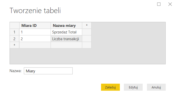 Tworzę dodatkową tabelę z dwoma kolumnami: ID miary oraz Nazwa miary.