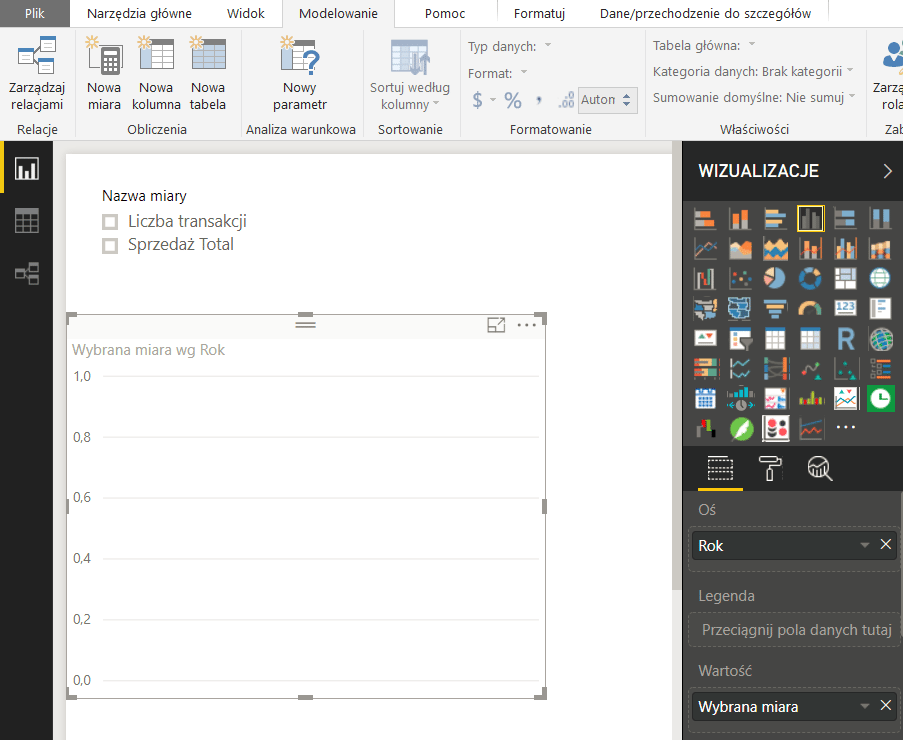 W opisywanym przykładzie wrzucam na wykres Rok do osi, a miarę Wybrana miara do wartości. Buduję też fragmentator na polu Nazwa miary.