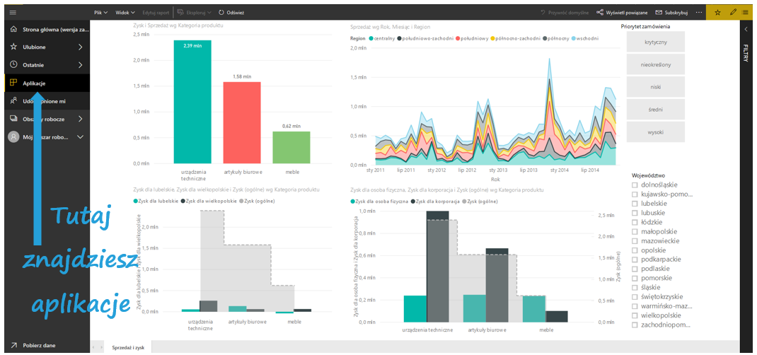 Następnie wciśnij Zakończ w prawym górnym rogu i aplikacja gotowa. Uwaga, bo osoba, której udostępnisz aplikację nie będzie jej miała dostępnej od razu. Power BI informuje, że nadanie dostępów może potrwać 5-10 minut, a w skrajnych przypadkach nawet 1 dzień. Ty natomiast masz wgląd od razu.