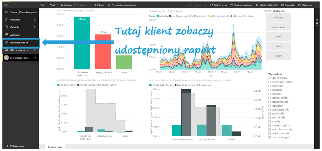 To bardzo wygodny i szybki sposób na pokazanie efektów swojej pracy przy zachowaniu kontroli nad uprawnieniami do raportu. Osoby, które otrzymają Twój raport mogą go obejrzeć w zakładce Udostępnione mi, ale uwaga, bo też muszą mieć wersję Pro Power BI.