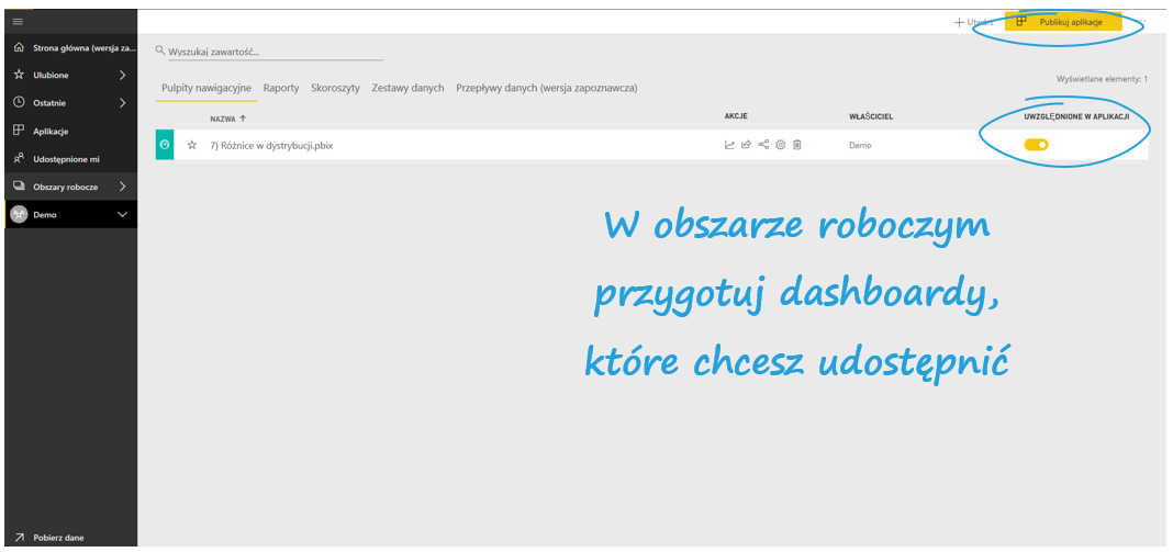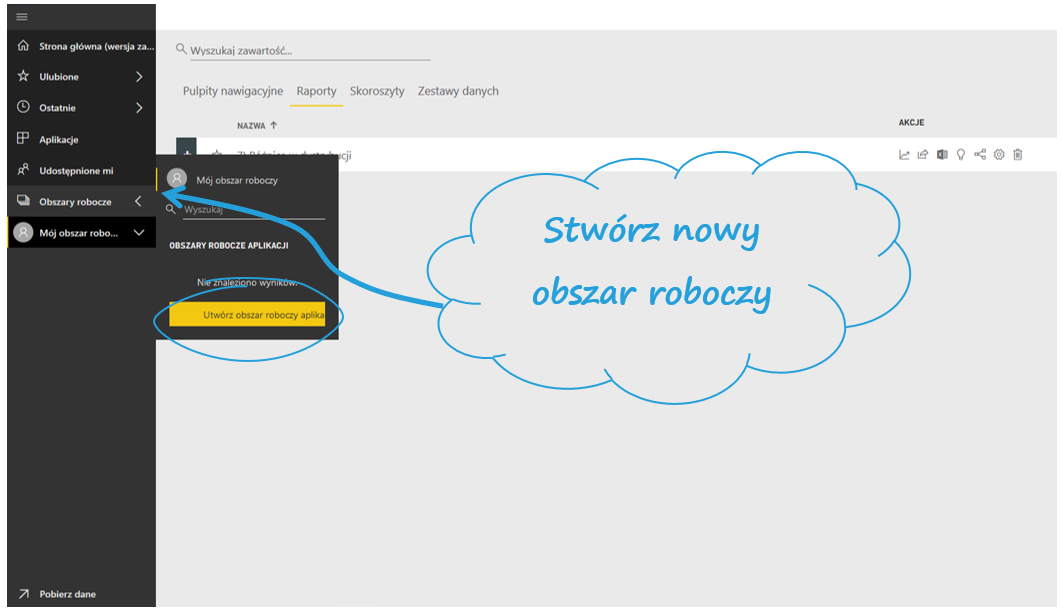 Obszary robocze (workspaces) odpowiadają na problemy, które występują przy zwykłym dzieleniu się dashboardami: brakiem możliwości edycji i dzielenia się wieloma plikami z jedną grupą osób. Aby je stworzyć, najedź na Obszary robocze po lewej stronie i żółte pole Utwórz obszar roboczy aplikacji.