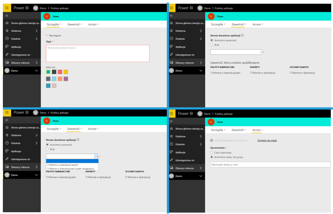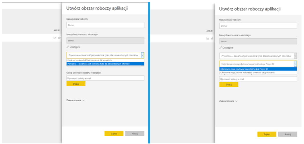 Po utworzeniu obszaru roboczego możesz korzystać z niego jak ze wspólnego dysku, na którym każdy edytuje jakąś część, co szczególnie ułatwia pracę, gdy wiele osób z jednego zespołu pracuje wspólnie nad zestawem raportów – Udostępnione mi nie będą pełne setek plików, w których trudno się odnaleźć. Dzielenie się obszarem roboczym nie jest najlepsze, by pokazać raport klientowi – końcowemu odbiorcy. Podzielenie się obszarem roboczym wymaga nadania takich samych uprawnień, a to może doprowadzić do wprowadzenia niechcianych, przypadkowych modyfikacji. Także przenoszenie treści między wieloma obszarami roboczymi jest trudne, bo… niemożliwe. Jeśli jeden projekt ma wiele obszarów roboczych, skopiowanie efektów pracy jest możliwe tylko przez zduplikowanie obszaru roboczego i nadanie nowych dostępów. Microsoft pracuje nad dodaniem nowych funkcji do tej opcji, także opcja ta na pewno ulegnie zmianie w przyszłości.
