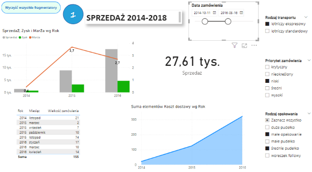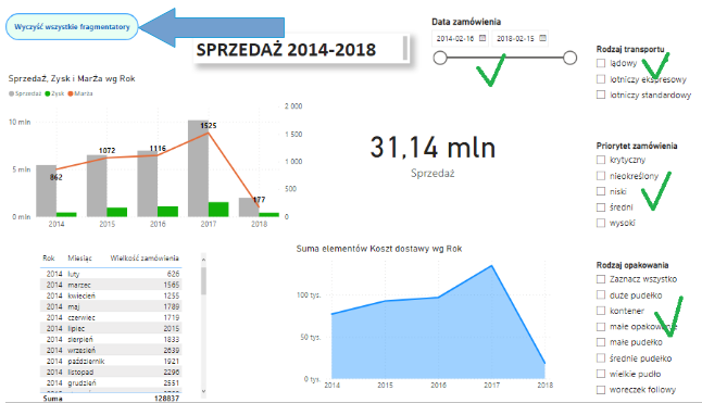 Po ustawieniu wybranych przez nas fragmentatorów, klikamy utworzony przez nas przycisk Wyczyść wszystkie fragmentatory z przyciskiem Ctrl (dot. Power BI Desktop).