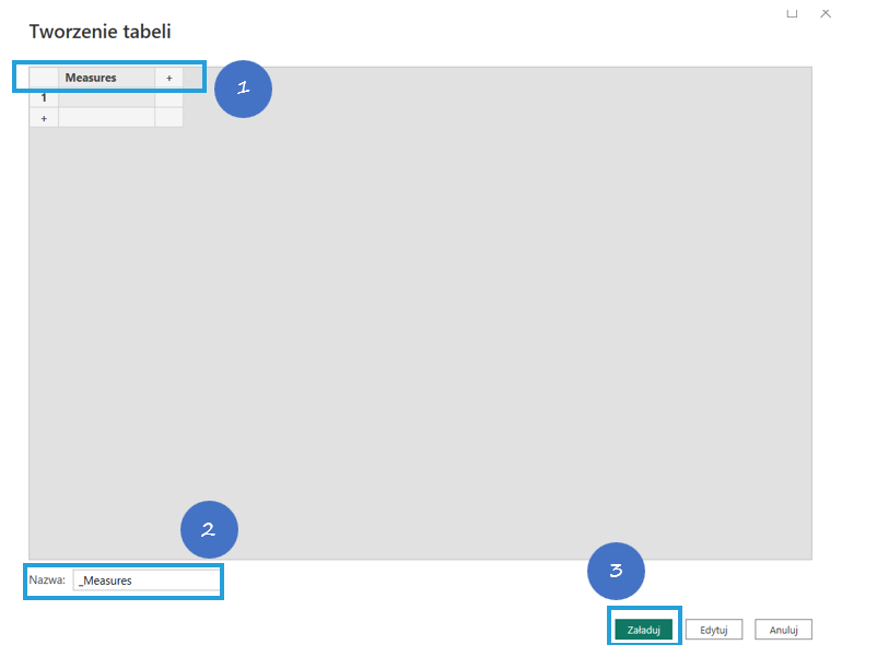 Po wybraniu opcji, pojawi się okno, w którym możesz zdefiniować nazwę tabeli oraz kolumny. Z racji, że przykładowy model jest w języku angielskim, zastosujemy angielskie nazewnictwo – nasza tabelka będzie miała nazwę (_Measures). Pamiętaj, że nazwy niektórych obiektów są zastrzeżone (np. Measures), dlatego nazwę tabeli poprzedź znakiem podkreślenia „_” . Nazwę kolumny możemy ustawić jako Measures.