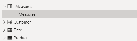 Właśnie utworzyłeś swoją tabelę _Measures, w której będziemy przechowywać definicje miar. Znajdziesz ją w modelu.