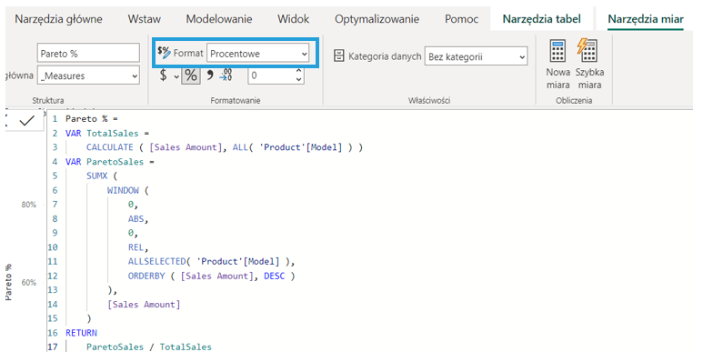 Pareto % = VAR TotalSales = CALCULATE ( [Sales Amount], ALLSELECTED ( 'Product'[Model] ) ) VAR ParetoSales = SUMX ( WINDOW ( 0, ABS, 0, REL, ALLSELECTED ( 'Product'[Model] ), ORDERBY ( [Sales Amount], DESC ) ), [Sales Amount] ) RETURN ParetoSales / TotalSales