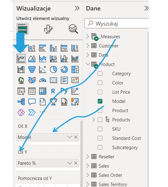 Wybierz wykres liniowy, następnie na osi X zaprezentuj atrybut [Model] z wymiaru [Product]. Z kolei na oś Y zrzutuj miarę [Pareto %]. Pamiętaj, żeby posortować oś, która zawiera miarę [Pareto %] w sposób rosnący.