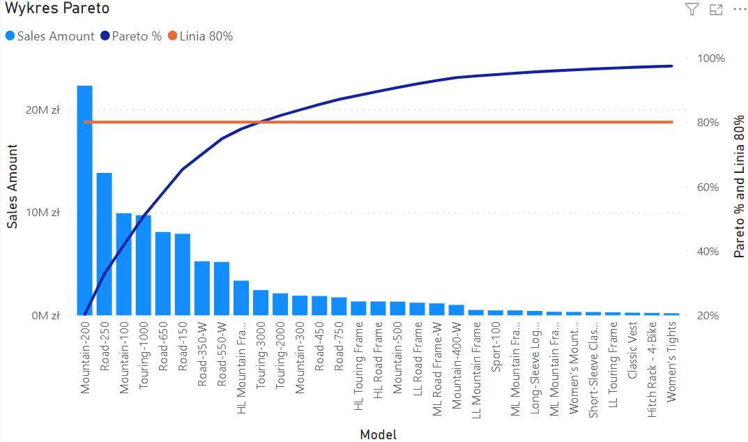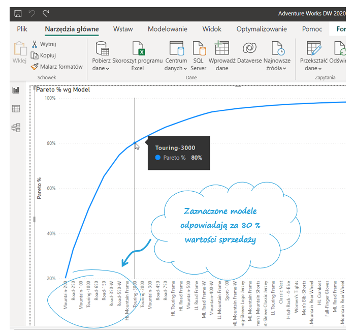 W naszym przykładzie z wykresem Pareto dla każdego modelu produktu powstanie jedno duże okno, które będzie obliczać skumulowaną wartość sprzedaży dla wszystkich produktów, które są wcześniej na osi x.