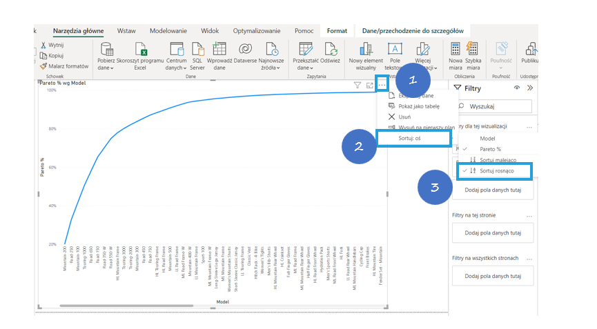 Wybierz wykres liniowy, następnie na osi X zaprezentuj atrybut [Model] z wymiaru [Product]. Z kolei na oś Y zrzutuj miarę [Pareto %]. Pamiętaj, żeby posortować oś, która zawiera miarę [Pareto %] w sposób rosnący.
