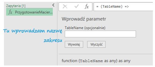 Dzięki wykonanym zmianom po prawej stronie, w oknie nawigatora jest widoczna funkcja. Po wybraniu jej z listy pojawia się okno do wprowadzenia parametru dla funkcji (wcześniej wprowadzonego TableName). Wprowadzam nazwę zakresu, który ma być przekształcony w wyniku działania funkcji : MacierzA > Wywołaj.