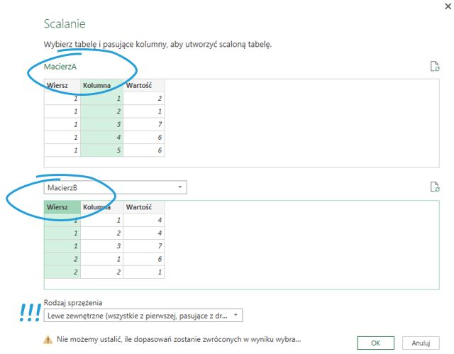 W następnej kolejności utworzę tabelę połączoną gdzie dla kolejnych kolumn Macierzy A dopasuję wiersze z Macierzy B. Zaznaczam na liście zapytań MacierzA > Narzędzia główne >Połącz > Scal zapytania > Scal zapytania jako nowe. Z Macierzy A zaznaczam Kolumnę zaś z MacierzyB zaznaczam Wiersz. Jako rodzaj połączenia tabel wybieram Lewe zewnętrze > OK.