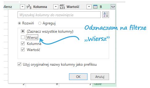 Klikam a podwójną strzałkę w kolumnie B i z listy wyboru oznaczam Wiersz, pozostawiam zaznaczoną opcję Użyj oryginalnej nazwy kolumny jako prefiksu (co pozwoli mi później odnaleźć się w danych).