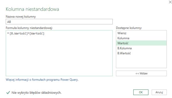 Nazywam ją AB oraz wprowadzam formułę wymnożenia kolumn między siebie.