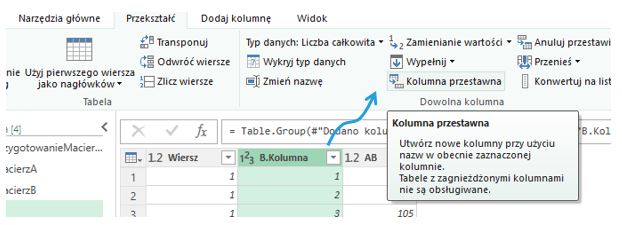 Wynikiem mnożenia macierzy jest macierz o ilości wiersz z Macierz A oraz ilości kolumn z Macierzy B. Zaznaczam kolumnę Wiersz oraz B.Kolumna Przekształć > Grupowanie według