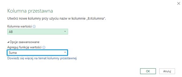 Wskazuję która kolumna jest kolumną z wartościami oraz jaka operacja ma być wykonana na danych, tym przypadku Suma.