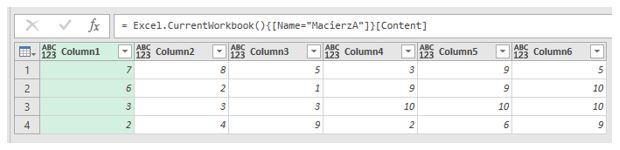 Dzięki funkcji powstaje nowe zapytanie, zmieniam jego nazwę na MacierzA. Takie same kroki wykonuję dla drugiej macierzy, zmieniam nazwę zapytania na MacierzB.