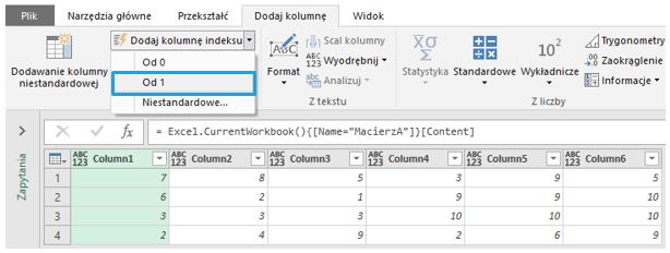 Wybieram Dodaj kolumnę > Dodaj kolumnę indeksu > od 1.