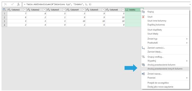 Zostanie dodana nowa kolumna z numerem wiersza. Wybieram ją i prawym przyciskiem myszy rozwijam menu podręczne z którego wybieram Anuluj przestawienie innych kolumn.