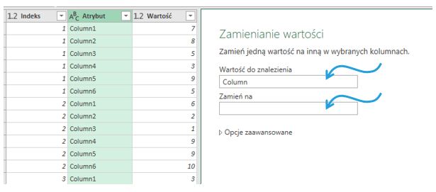 - Zamiana w drugiej kolumnie słowa ColumnX na X : PP myszy > zamień wartości > w polu Wartość do znalezienia wpisuję Column, Zamień na pozostawiam puste