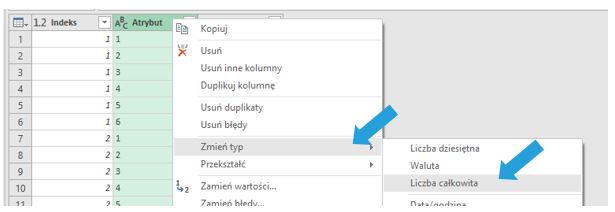 - Po powyższej operacji kolumna ma format tekstowy, więc zmieniam go na liczbowy : PP myszy > Zmień typ > Liczba całkowita