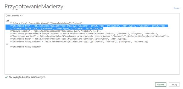 Na początku zmieniam nazwę zapytania na PrzygotowanieMacierzy. Następnie zmieniam ciąg wykonanych operacji na funkcję. Wchodzę do Edytora zaawansowanego i dodaję w pierwszej linii wyrażenie (TableName) =>