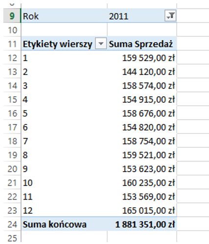 Spróbujmy zbudować prost zestawienie sprzedażowe, które za chwilę urozmaicimy miarą pozwalającą na dynamiczne analizowanie zmian. Zacznijmy od zbudowania tabeli pokazującej sprzedaż po miesiącach z możliwością filtrowania lat: