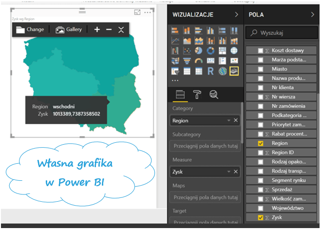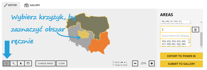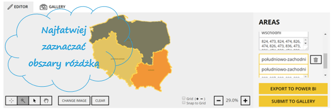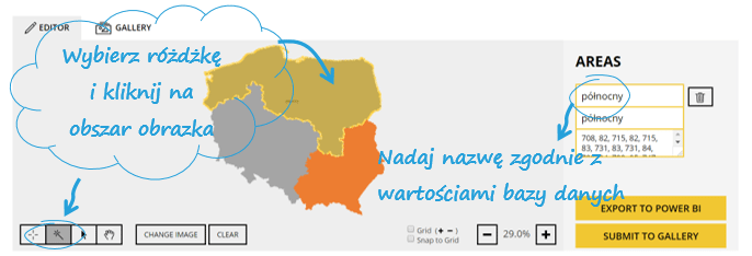 Teraz wystarczy zaznaczać interesujące nas fragmenty i nadać im unikatowe nazwy. Uwaga! Nazwy części obrazu muszą być takie same jak wartości w kolumnach, z których będziemy korzystać, by zwizualizować dane! W przykładowej bazie danych sprzedażowych mam informacje o przydziale konkretnego klienta do jednego z trzech regionów: północnego, wschodniego oraz południowo-zachodniego. Takie też muszą być nazwy zaznaczanych części, by Power BI mógł połączyć bazę z obrazem.