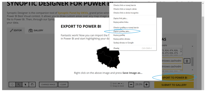 Tak zaznaczony i opisany obraz można już wyeksportować do Power BI. Kliknij w prawym dolnym rogu Export to Power BI i zapisz plik w formacie SVG.