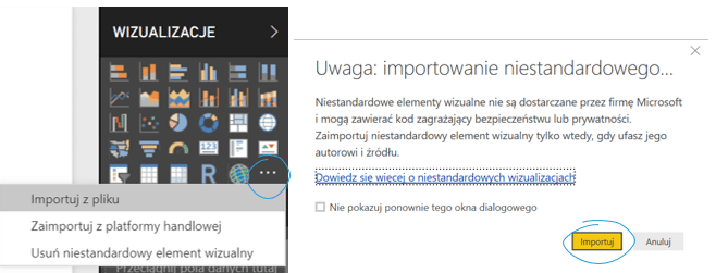 Aby skorzystać z przygotowanej w Synoptic Designer mapy potrzebujesz dodatku do obsługi niestandardowych wizualizacji Synoptic Panel by OKViz do pobrania ze strony. Wgraj go do Power BI klikając w panelu Wizualizacje na trzy kropki i potem Importuj z pliku.
