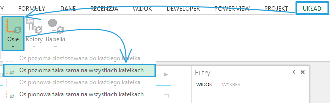 Można zmienić sposób wyświetlania danych w taki sposób, aby w każdym kafelku skala osi była jednakowa. Aby to zrobić, musimy zaznaczyć wykres słupkowy znajdujący się w polu kafelków. Aktywuje się wtedy przycisk Osie znajdujący się w zakładce Układ. Wybieramy opcję Oś pozioma taka sama na wszystkich kafelkach.
