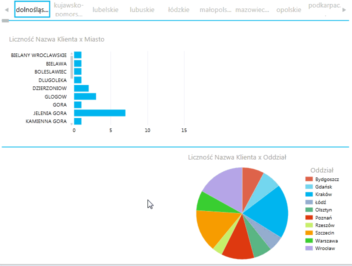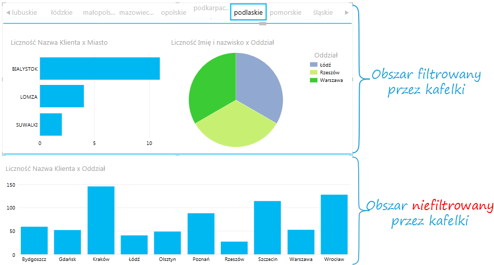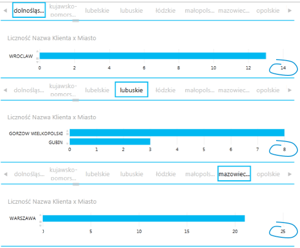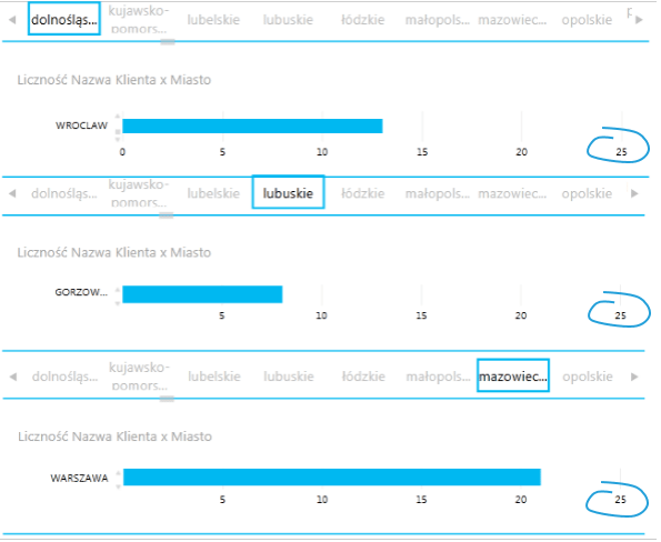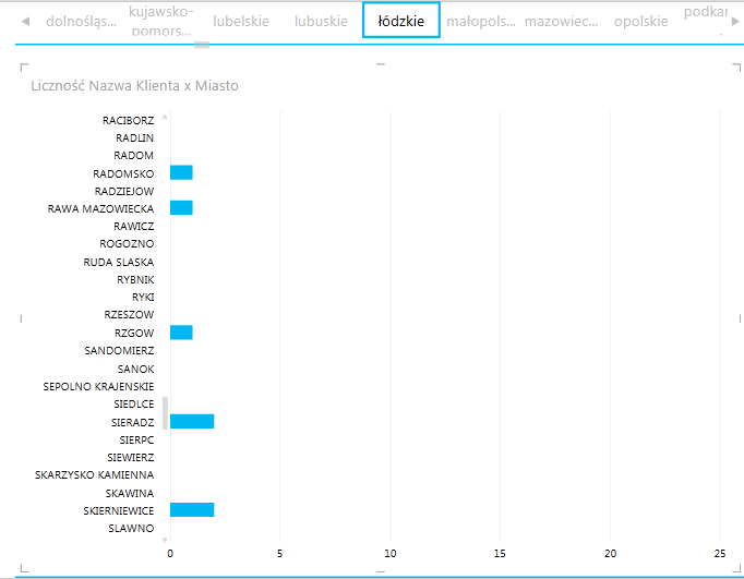 Ze względu na oczywiste różnice w charakterze danych (liczba klientów należy do danych ilościowych, miejscowości – do danych jakościowych) działanie tej opcji jest inne. Po wykonaniu powyższych operacji na osi danych jakościowych będą cały czas wyświetlane wszystkie możliwe opcje (oś wygląda tak samo, jakby nie była przefiltrowywana przez narzędzie kafelków). Etykiety osi, które zostałyby przefiltrowane, mają przyznaną wartość zero.